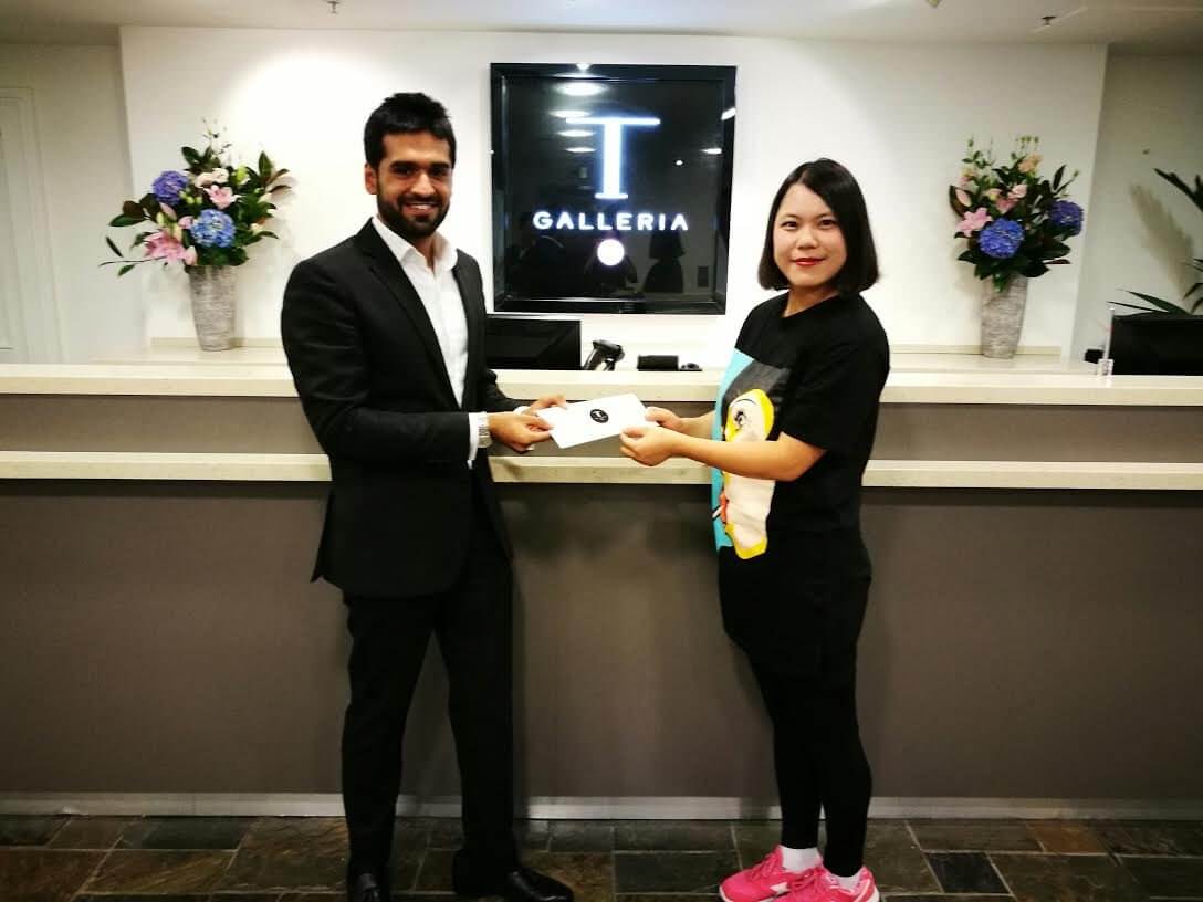4月12日星期三,DFS奥克兰店总经理Mahboobani先生将500纽币的现金礼券交到了幸运中奖者汪太太手中。