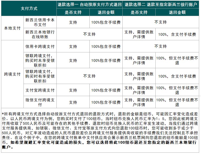 两种。一种是按照原支付方式原路退回,第二种是退款到您指定的新西兰本地银行账户。所有本地支付,如新西兰银行转账或本地纽币信用卡退款不会有任何损失;而选择跨境支付方式支付的订单退款时因外汇汇率变动可能会造成差异。具体的退款方式如下表: