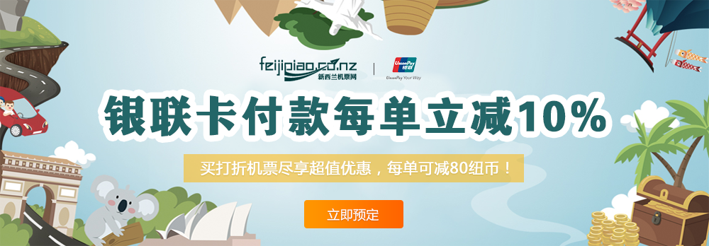 (1)2017年11月24日起在feijipiao.co.nz购买机票,选择银联卡支付,每单立减10%,最高折扣幅度可达80纽币。例如您的订单金额为400元,使用银联卡支付款,可按360元加支付手续费进行支付。如果您的订单金额为900元,则可按820元加支付手续费进行支付。