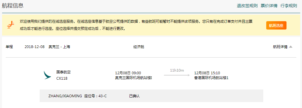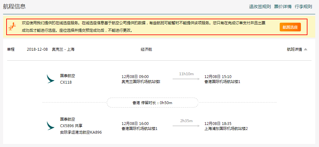 (3)选座成功后,座位信息展示在航程信息内。