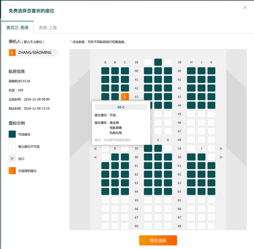 (2)选择您每个航段喜欢的座位,确认座位之后提交选座。