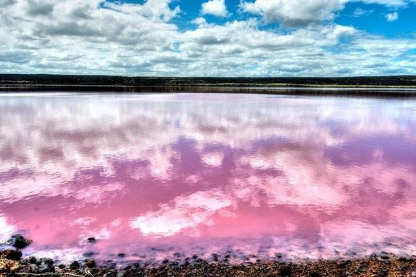 地面欣赏粉红湖的神奇,一摊不起眼湖水,在太阳的折射下,粉红湖泊散散发光。