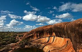 如果你一时没有机会去澳洲中部瞻仰那块瑰丽神奇的“澳洲之心”,那么身处澳洲西部的你,不妨去观赏大自然鬼斧神工在澳洲留下的又一奇迹,波浪岩吧。波浪岩是一块波浪形状的单片岩,它高15米、长110米、犹如滔天巨浪高高掀起并瞬间凝固半空中,它身上有一条条红褐色、黑色、黄色和灰色的条纹,阳光映射下漂亮极了,绝对你从珀斯跋涉近350公里的漫长道路来这里观看。接下来,你要不要在这个固体波浪上摆一个冲浪的姿势呢?